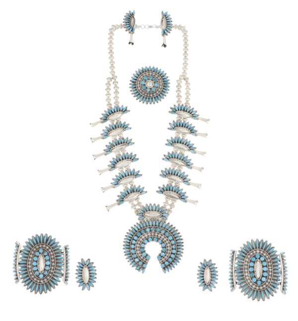 7 piece Navajo turquoise and sterling silver jewelry set by Luther Begay. Necklace measures 24 1/4" with a 3 1/2" x 3" naja pendant, cluster pin measures 2" x 2", post back earrings measures 2" x 3/4", size 8 1/2 ring and measures 1 1/2" x 1", bracelets measure 5 1/4" x 2 3/4" width with a 1" opening.