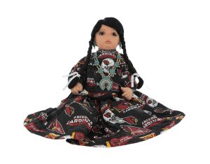 Handmade by Navajo artist Cheryl Yazza of Four Corners. Cheryl has made a limited number of these dolls; The Code Talker and his wife, the Blue Star parents and Gold Star parents - but never has she created the the entire six piece set as she has done exclusively for the Cameron Trading Post. The brave Navajo marines known as "Code Talkers" used their Native language to relay messages during WWII. The unbreakable code was pivotal to the allied victory in the Pacific. Cheryl Yazza created her own molds and hand poured the porcelain for the heads and faces of each doll. Meticulous in her art, she hand painted each face, and carefully researched and executed by hand each costume to depict the traditional clothing and jewelry of these beautiful dolls. We are proud to offer the entire one-of-a-kind set commemorating the bravery and sacrifice of the Navajo Code Talkers and the Navajo soldiers and their families who have given all in service to their country.