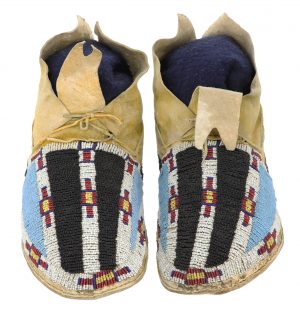 Native tanned deer hide, rawhide, porcupine quill, Venetian beads, tin cones, dyed horsehair, yellow, and red ochre, German silver button. Sinew and cotton thread. Strike-a-light pouch sewn on one side. Beaded panel, interestingly beaded in flat stitch on one side and lazy stitch on the other. Beaded with different geometric designs on each side. Two vertical rows of beads meet to form triangles above the panel, terminating in tin cone decorations with dyed horsehair tufts and red ochre in the plain field inside the triangle. Strike-a-light with tin cones and a German silver button on the flap. beaded lip and seams. Painted all over in yellow ochre.
