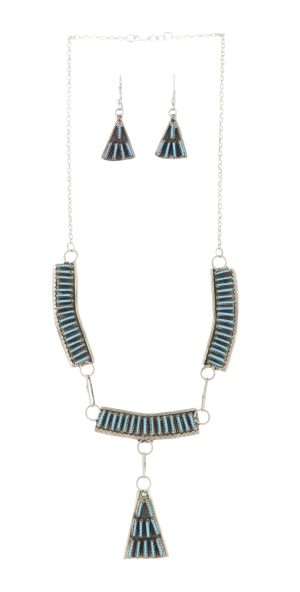 Cameron Trading Post is proud to offer a fine selection of Native American jewelry and Southwest jewelry, featuring a wide variety of Navajo silver, turquoise, and inlay, Santo Domingo heishi, Hopi sterling overlay, and beautiful turquoise petitpoint, needlepoint, and inlay Zuni jewelry. Navajo Indian jewelry and Zuni jewelry are renowned for their intricate use of turquoise and other semi-precious and precious stones and shell. A turquoise necklace, turquoise bracelets, and turquoise earrings have been and still are favorites among visitors and residents alike who love Southwestern jewelry.