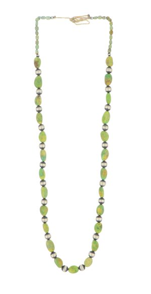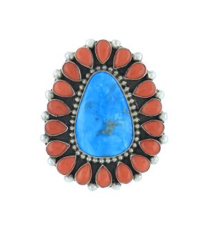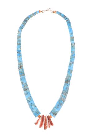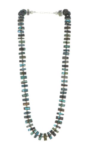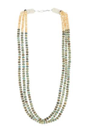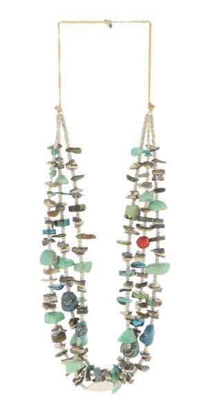 Turquoise is Native to Southwestern jewelry and has been used in Native American Indian jewelry for centuries. Beads and carvings shaped and drilled from turquoise as well as shells and other semi-precious stones available through trade routes throughout the Americas are a strong tradition that continues today, especially among the Pueblos.