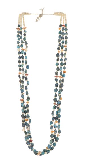 Turquoise is Native to Southwestern jewelry and has been used in Native American Indian jewelry for centuries. Beads and carvings shaped and drilled from turquoise as well as shells and other semi-precious stones available through trade routes throughout the Americas are a strong tradition that continues today, especially among the Pueblos.