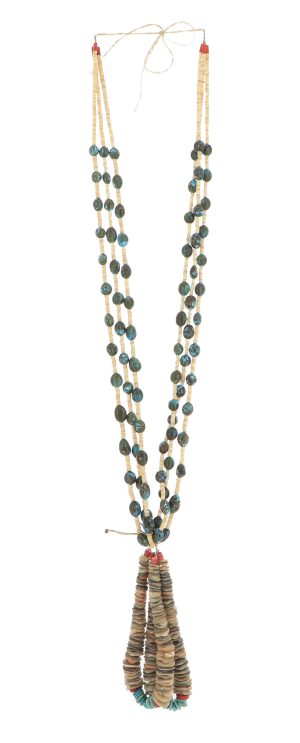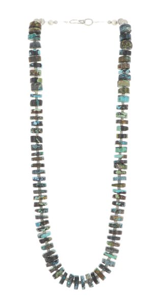 Turquoise is Native to Southwestern jewelry and has been used in Native American Indian jewelry for centuries. Beads and carvings shaped and drilled from turquoise as well as shells and other semi-precious stones available through trade routes throughout the Americas are a strong tradition that continues today, especially among the Pueblos.