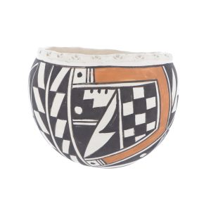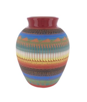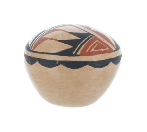 Navajo pottery is distinguished by its hand-coiled construction, a method that has been preserved over centuries. Artists use native clay, shaping each piece by hand without the use of a potter’s wheel, and then decorate them with traditional designs using natural pigments.