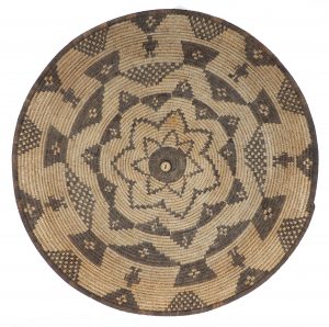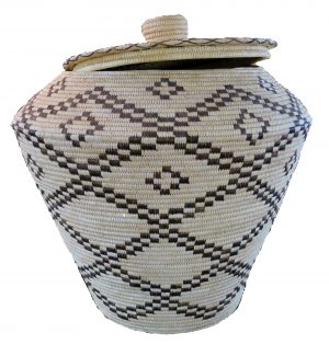 The basket is perhaps the oldest invention of Native American culture. Fragments of baskets and other weavings are found in the earliest sites of the “ancient ones”, those peoples thought to be the predecessors of today’s modern Puebloans who left their dwellings and mysterious painted symbols on stone and vanished. Originally utilitarian, Native American baskets were used for cooking, carrying, and storage, but as with all utilitarian items of the Native Americans, they were also an expression of art and Tribal identity. At the turn of the century, Native American baskets began to be woven for trade as well as for tribal ceremony. Being made of organic materials, few antique Native American baskets survive.