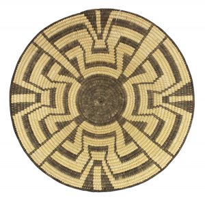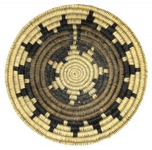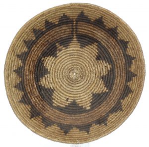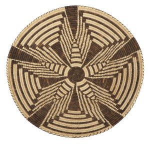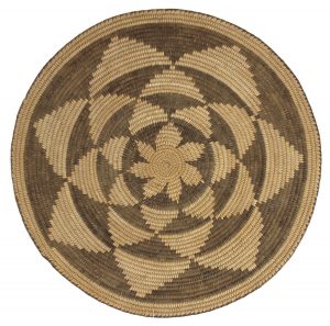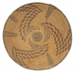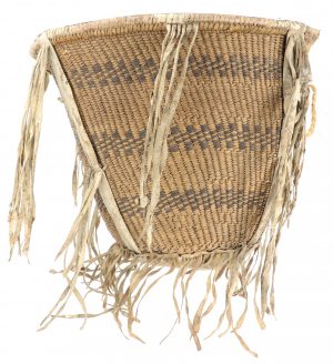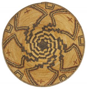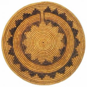The basket is perhaps the oldest invention of Native American culture. Fragments of baskets and other weavings are found in the earliest sites of the “ancient ones”, those peoples thought to be the predecessors of today’s modern Puebloans who left their dwellings and mysterious painted symbols on stone and vanished. Originally utilitarian, Native American baskets were used for cooking, carrying, and storage, but as with all utilitarian items of the Native Americans, they were also an expression of art and Tribal identity. At the turn of the century, Native American baskets began to be woven for trade as well as for tribal ceremony. Being made of organic materials, few antique Native American baskets survive.