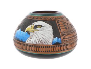 The color, shape, and design of Native American pottery is influenced by the Pueblos culture. In the Southwest, pottery making is an heirloom passed from one generation to the next. Santa Clara and San Ildefonso pottery is known for its black or red color and high polish, a technique revived by Maria Martinez and her husband Julian. Acoma pottery is famous for thin walls and intricate painting. Hopi pottery with its sublime form, symbolic designs, and earth-toned slip is also world renowned. Please browse our Acoma pottery, Hopi pottery, historic pottery, horse hair pottery, and storytellers selections for beautiful and antique designs from artists from various Native American tribes.