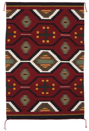 Vegetal dyes, many discovered or recovered in the last 50 years, lend their soft and pleasing pastels to the rugs of Crystal and Chinle and Wide Ruins. J.L. Hubbell, Indian trader at Ganado did much to revive Navajo weaving at the turn of the century and many of the Navajo rugs from that region still display the dark “Ganado red” as popular today as it was then. You can appreciate and shop through our Ganado rug collection here.