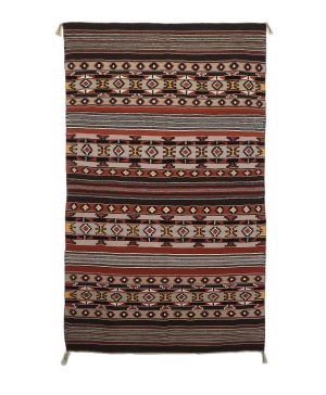 Patterns in the Southwestern rugs seen today are historically based in the antique rugs of the past. The intricate designs and natural colors seen in a Navajo Southwestern area rug is a culmination of influences from the early trading posts, early Mexican colonists, and aspects of white American design culture, but all these the Navajo have incorporated and made into their own. Shop Navajo rugs for sale online at the historic Cameron Trading Post, or browse all other Native American art here.
