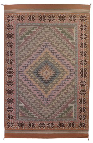 The Navajo rug design known as Burntwater was developed by Bruce Burnham and Don Jacobs at the Burntwater Trading Post near Sanders, AZ. These traders encouraged their local weavers to create very fine weavings using the Central Diamond and Four Sacred Mountain design introduced from Oriental rugs to the Navajo by traders at the turn of the century in an attempt save the art of Navajo weaving by opening Eastern markets in the United States. Navajo Burntwater rugs are known for their beautiful pastel colours derived from Native vegetal dyes and also for their excellence in weave. Burntwater rugs are a more recent development of the late 1960s but exemplify the role the Trader still plays in encouraging local weavers. Mr. Burnham continues to work with his weavers in encouraging new designs and is largely responsible for the New Germantown Navajo rugs using contemporary yarns from Germantown, PA and old 1880 Germantown rug designs to inspire the talented Navajo weavers of the Burntwater area.