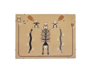 The first Navajo handmade Navajo painting successfully made permanent on a board for sale was created in the 1950’s by a medicine man named Fred Stevens. The idea was suggested to him by Rex Bollin, a trader at Box Canyon, Arizona and the process used to adhere the sand to the board was developed in collaboration with Mr. Stevens, Mr. Bollin, and Arizona artist George DeVille who had been using sand as a painting medium for several years.