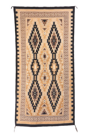 Hand carded, hand spun wool yarn. Natural white and dark brown, carded gray, vegetal tan(wild carrot), aniline red. Serrated central design with interlocking diamond outline. Curved design elements typical of the Bisti region. Color change in background over half the rug.
