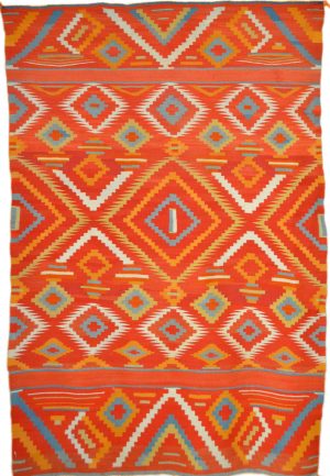 Hand carded and hand spun wool yarn in natural white and brown, carded gray and wild carrot vegetal dye. Bold double crosses with gray geometric inside terminating in classic Bisti curls. 8 pointed stars and wide meandering border.
