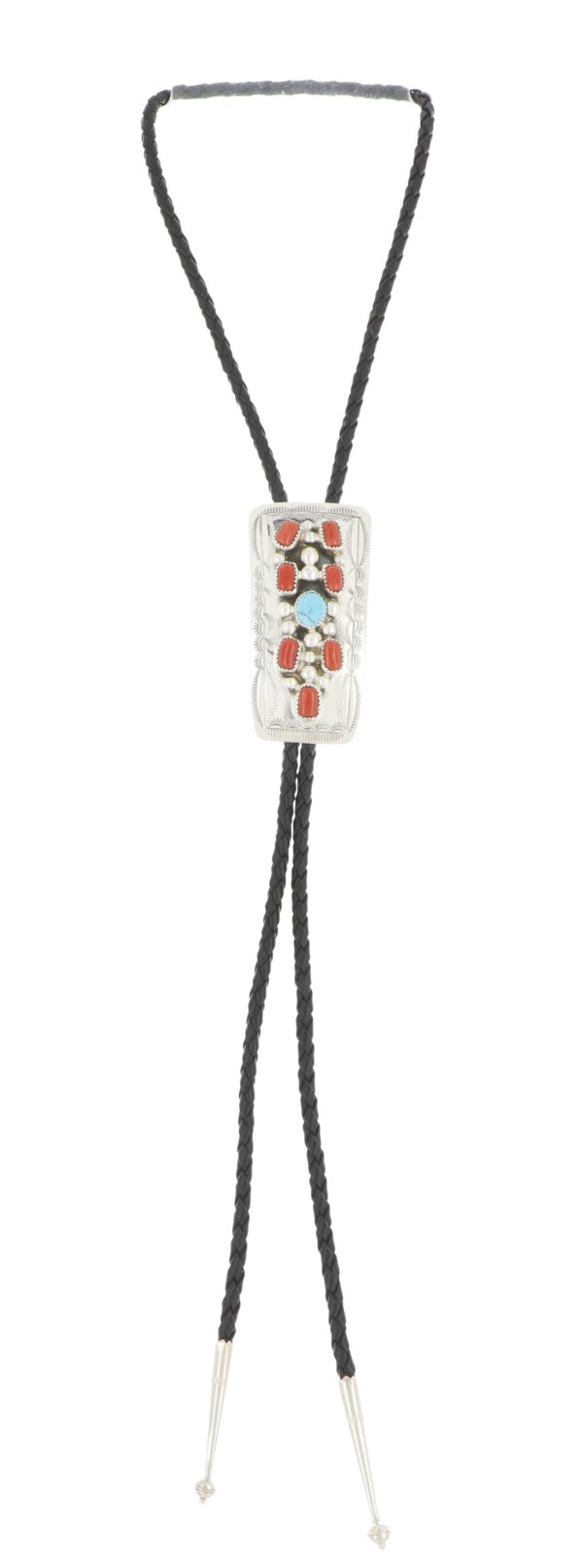 Navajo bolo tie features seven corals and a Kingman turquoise stone set in sterling silver with silver bead accents on a 38 1/2" black leather cord with silver cone tips.