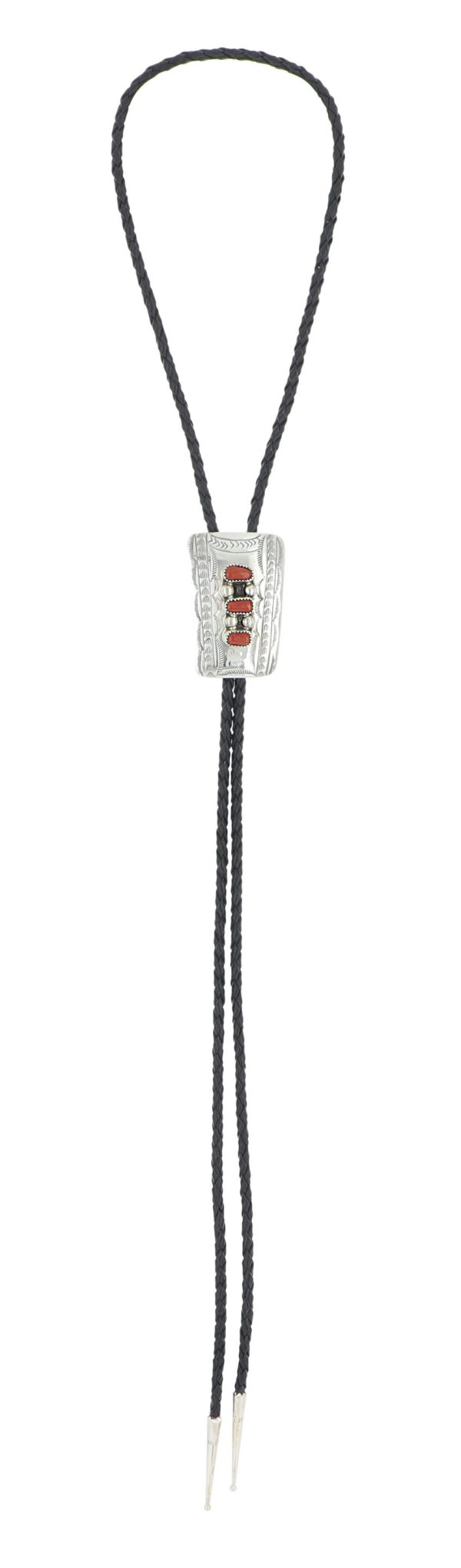 Navajo bolo tie features a sterling silver ornament with three coral stones and stamped designs on a 48" black leather cord by Wilbert Meyers.