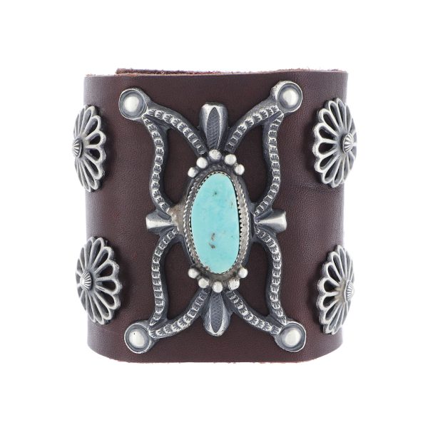 Navajo bow guard features an oxidized sterling silver and turquoise stone design in the center set on a brown leather strap.