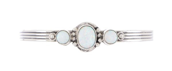 Navajo sterling silver bracelet with three opal stones and silver bead accents by Judy Largo. Bracelet has a 1 1/4" opening.