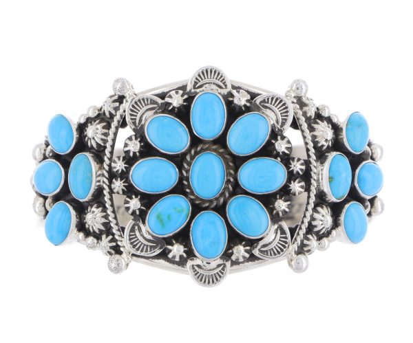 Navajo sterling silver cluster bracelet features Sonoran Gold turquoise stones adorned silver twist wire, silver beads, and stamped silver buttons by Linda Linkin. Bracelet has a 1" opening.