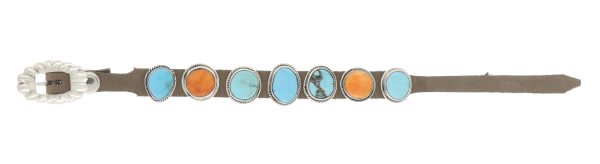 Navajo bracelet features orange spiny oyster shell and turquoise stones set in sterling silver and set on a brown leather strap bracelet by Brandon Williams.