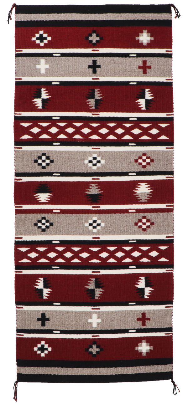 Navajo rug runner with a Chief Revival design made with commercially dyed wool by weaver Bessie Yazzie.