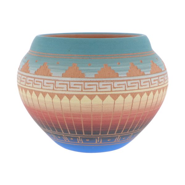 Red clay Navajo etched pottery with painted and etched designs by Everett Whitegoat.
