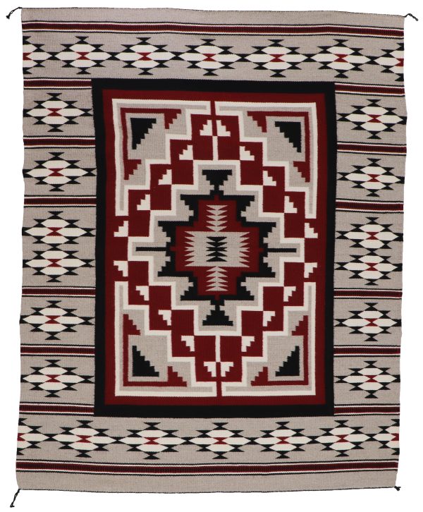 Navajo rug with a Ganado design in the center and a Chinle design bordering the rug by weaver Kathy Tso. Rug is made with commercially dyed wool.