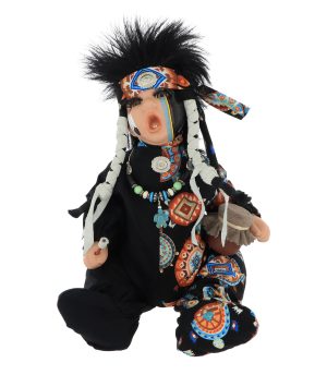 Navajo handmade porcelain doll by Cheryl Yazza. Doll is dressed in a green felt shirt with black pants adorned with a Navajo sash belt, bracelets and earrings.
