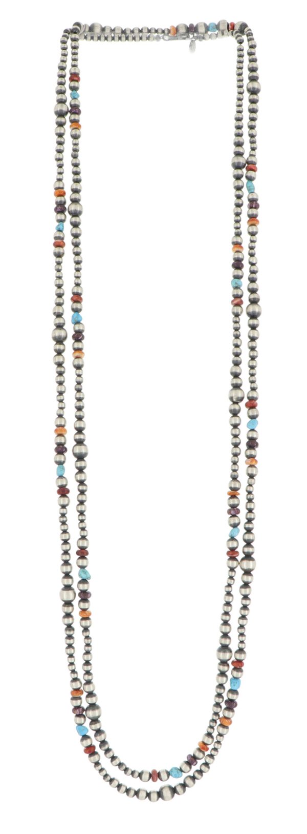 Three strands Navajo necklace with oxidized silver beads adorned with turquoise, orange, red and purple spiny oyster shell bead accents.