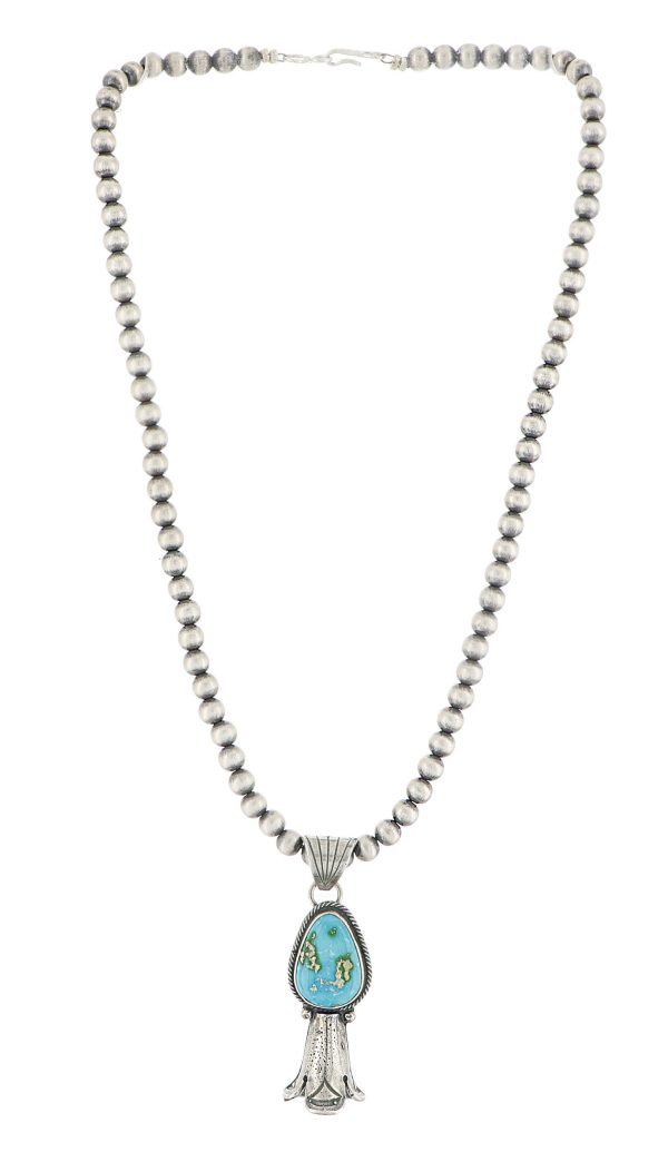 Single strand Navajo pearl necklace with a squash blossom and turquoise pendant by Verlene Betone.