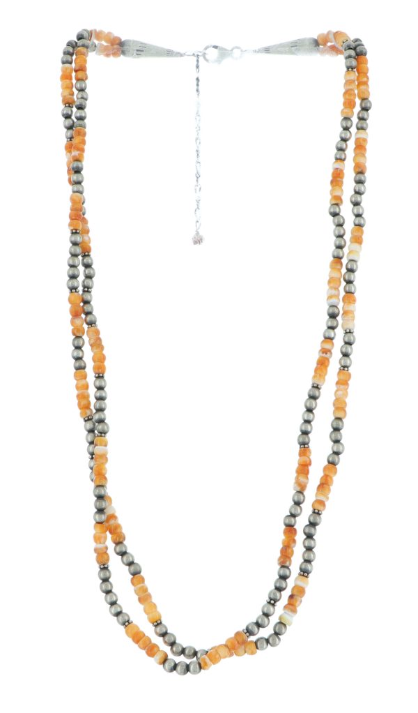 Double strand Navajo necklace features silver pearls and orange spiny oyster shell beads.