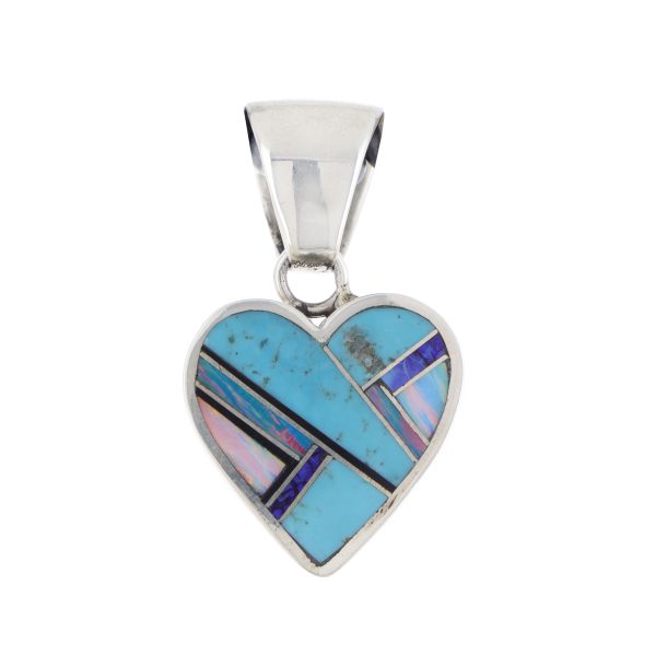 Sterling silver heart pendant features turquoise, opal, and jet inlay stones with silver channels.