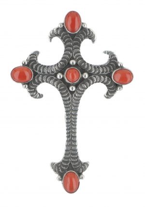 Sterling silver lizard shaped pendant with stamped details and coral adorned with silver bead accents by Lee Charley.