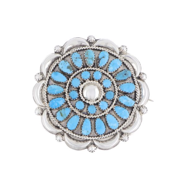 Navajo cluster pin with Kingman turquoise stones set in sterling silver adorned with silver twist wire and bead accents by Luther Begay.