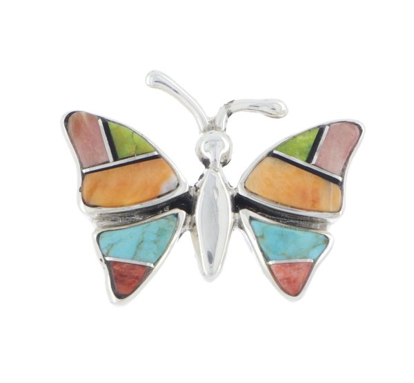 Navajo inlay butterfly pendant with turquoise, gaspeite, jet and orange spiny oyster shell set in sterling silver.