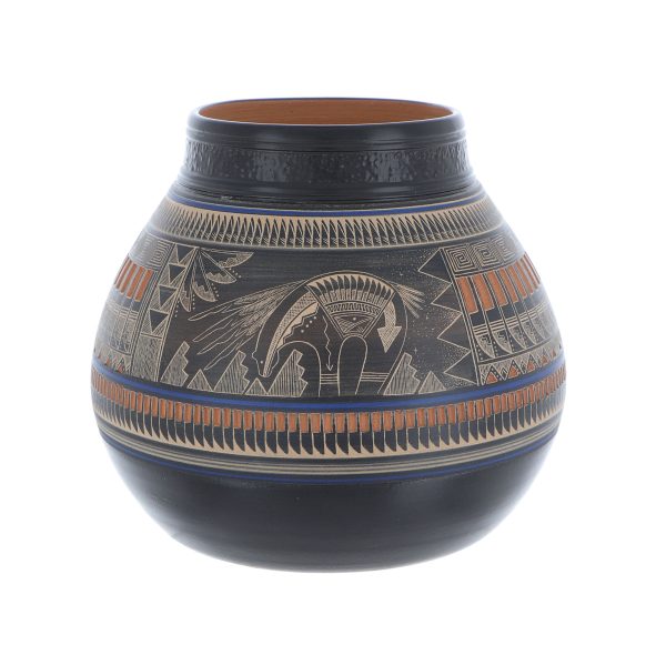 Navajo etched pottery with traditional geometric etched designs and etched fetish bear by Bob Lansing.