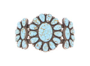 Sterling silver ring with Bisbee azurite stone and silver beads bordering the bezel and a silver leaf accent.