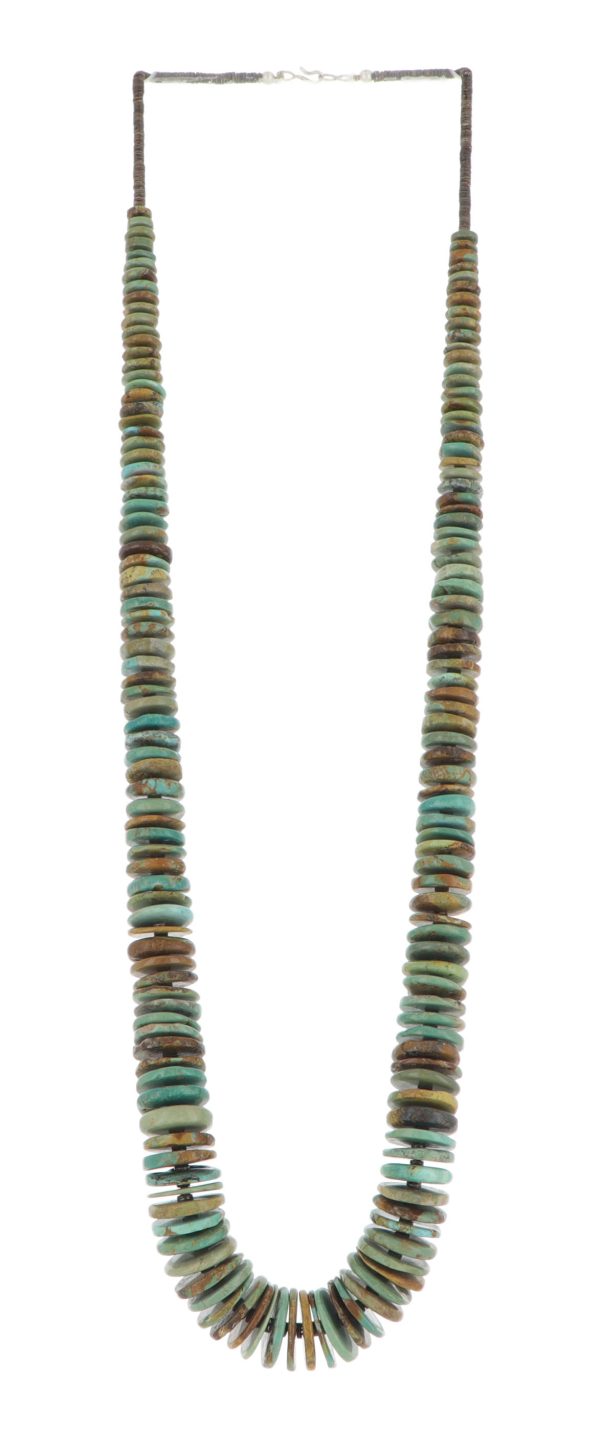 Santo Domingo necklace with Kingman turquoise and Royston turquoise beads with taper design to pen shell heishi beads by Raymond Tenorio.