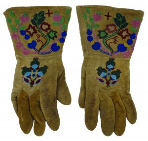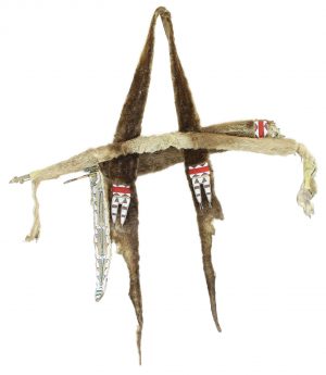 This Ute beaded doll cradle with Native tanned deer hide, willow, Venetion beads, faceted brass beads, rrade cloth, yellow ochre. Ute style cradle with outer beading reminiscent of Lakota work. Beaded hide stretched over willow rods. Long fringes cut on the back. Remnants of yellow ochre. Marked on the back in script; Dr. J. Stark.