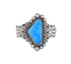 Navajo sterling silver bracelet with coral inlay design by Sheldon Lalio. Bracelet has a 1 1/4" opening.