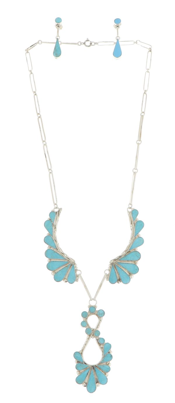 Zuni sterling silver and turquoise inlay necklace with silver channels and silver bead accents on a link style chain. Earrings measure 1 1/4" x 1/2".